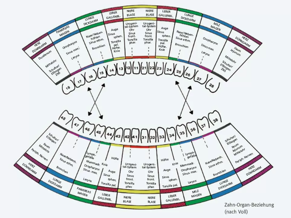 Jeder Zahn steht über Nerven, Blutgefäße und Energieleitbahnen (Meridiane) mit bestimmten Organen in Verbindung.